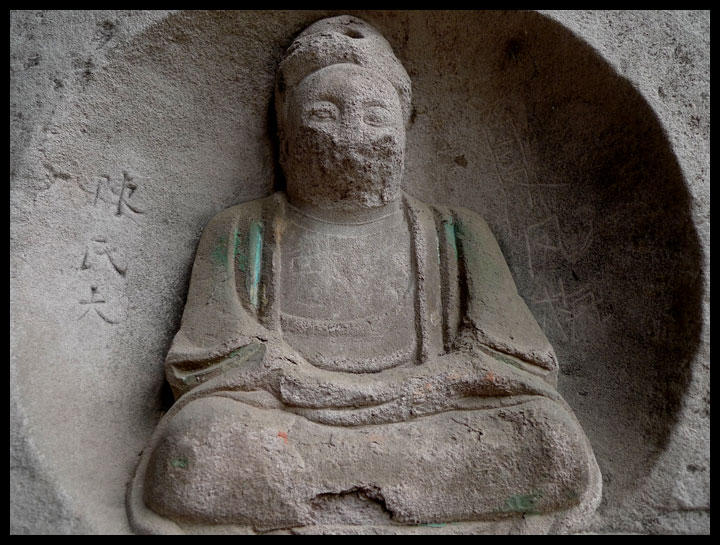 Druhý den jedeme do poměrně vzdáleného městysu Shiyang 石洋, jehož nejúžasnější atrakcí je kromě pouličního prodejce tradiční čínské medicíny jeskyně Pilu dong 毗卢洞, která skýtá množství soch různých velikostí. Hlavu mají všechny, což je rozhodně dobrá zpráva. Co ale nezvládli Číňané za KR, to dohánějí dnes – nožem do soch vyryli svá jména. Bublá ve mně zlost a místy mě nepříjemně napadají poměrně nacistické myšlenky. Vše ale držím pod pokličkou, z papiňáku upouštím páru drápáním se na kopec do další, o trošku méně působivé, ale stejně zajímavé jeskyně Huayan dong 华严洞, která obsahuje velmi zachovalé exempláře. Obě jeskyně jsou totiž skryty v místním bujném porostu a rudé gardy s vypláchnutými mozky je patrně neměli šanci objevit. Celé toto místo je poměrně blízko věhlasnému komplexu Dazu 大足 v chongqingské municipalitě. Jediným rozdílem je, že o těchto místech nikdo neví a většinou se neplatí žádné vstupné. A když už, tak pouze symbolické. Poslední socha, která leží téměř na hranici provincie se nazývá Kongque dong 孔雀洞, nad níž trůní chrám z dynastie Tang s dobovou, poměrně nechutně a násilně „opravenou“ pagodou. Jak říká jedna moje kamarádka z chengduského trhu se starožitnostmi, „toto místo bylo zničeno takzvanou současnou kulturou“.