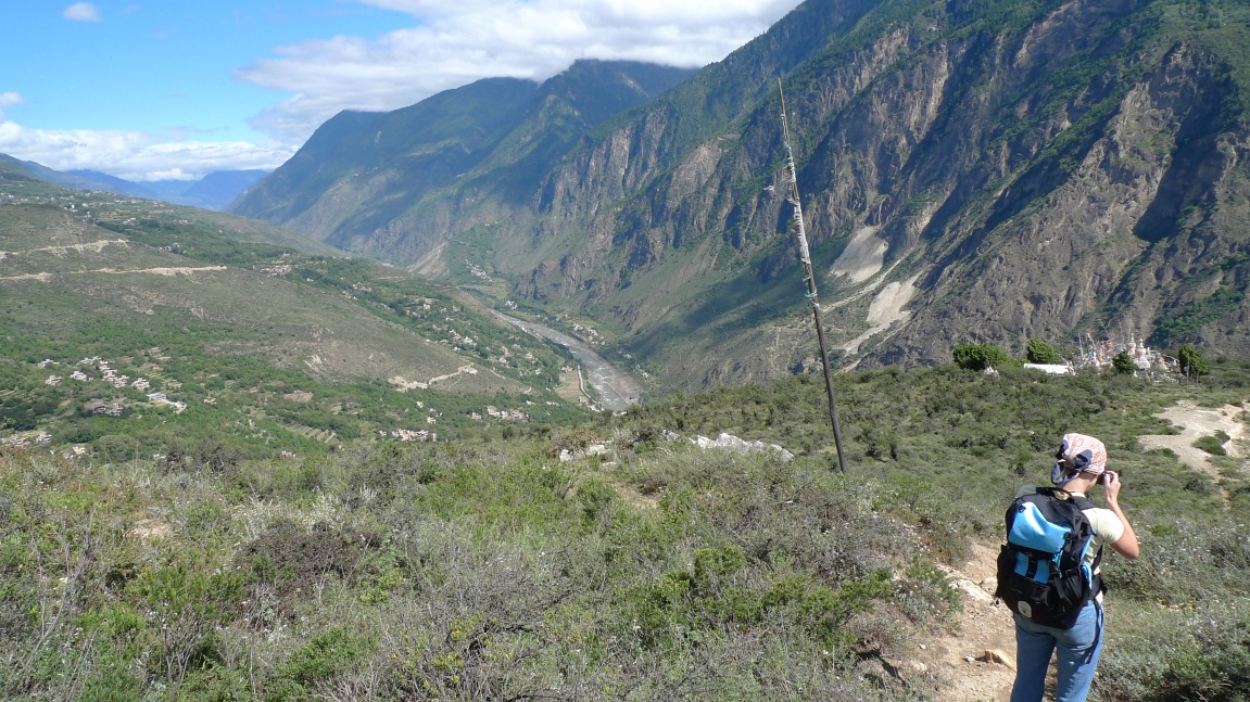 První zastávkou měl být taoistický chrám Chuanwang gong 川王宫, ale kvůli jeho opravě byl zavřený. Pozoruhodnou stavbu jsme tak byli nuceni prozkoumat zvenčí. Jako už tolikrát, tento prvotní neúspěch vedl k řetězu dalších zajímavých událostí. Po chvíli chůze proti proudu řeky jsme narazili na první místo se sochami. Byly vyryté v pískovcovém masivu, který trůnil jen pár metrů nad vodním tokem. Člověk se tak musel pořádně vyklonit, aby něco vůbec viděl. Na kopečku nad tímto místem byl další, tentokrát buddhistický chrám, z něhož byl krásný výhled na ohyb řeky. Po další chvíli jsme dorazili k řetězovému mostu a po projítí bambusovým hájem na nás vybafla vesnice a kukuřičné pole. Mísily se ve mně různé pocity. Některé momenty mi připomínaly dětství na Sázavě, pak zase Laos a zbytek JV Asie. Nechali jsme se unést krajinou tak, že jsme prošvihli poslední autobus zpátky do civilizace...
