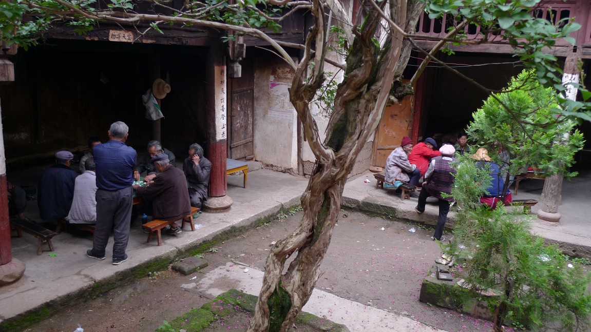 V uličce bylo mnoho původních dřevěných domů i nízký podchod s trámovím pod kamenným opevněním. V jedné čajovně ovšem bylo živo, seděly tam desítky postarších až starých lidí, bodrá paní čajovnice mezi nimi neustále rotovala s velkou kovovou konvicí a dolévala horkou vodu do náhodně položených šálků, misek a termosek. Právě probíhalo něco jako rapový „battle“, akorát šlo o tradiční tuej-čchang - zpěvný dialog v antifonním stylu – mezi vybranou dvojicí tvořenou vždy ženou a mužem. Šlo o čistokrevný „freestyle“, kdy první z dvojice zpěvně nahodil repliku a druhý reagoval. Vše probíhalo v místní sečuánštině, tudíž má úroveň porozumění nebyla kdovíjaká. Výbuchy smíchu či sborové uznalé mručení ale naznačovaly, že šlo místy jistě o lascivní, popřípadě velmi formálně promyšlený a vybroušený obsah. Posadil jsem se hned na kraj ke dveřím a za několik vteřin mi na stole přistál čaj – v půllitru a úplně stejným způsobem, jako ve starých dobrých českých vesnických hospodách – bez ptaní. Stál asi pět mao a útratu zatáhl pán ve slušivém obleku a s pečlivě upravenými vlasy. Staří lidé v čajovně byli evidentně rádi, že si mezi ně sedl mladý lao-waj a tato skutečnost je jistě vyhecovala k ještě lepšímu výkonu. Čaj tekl proudem. Muž s dlouhým vousem a nasazenými černými brýlemi, prošívaným tradičním bílým šatem se zdobnými vzory a masivní, hýčkanou dýmkou, dlouze pokuřoval a zvědavě si mě prohlížel. Lidé ochotně pózovali mému objektivu a já jsem jim na oplátku slíbil, že fotky vyvolám a odešlu na adresu čajovny: Siao-siang č.p. 33. Jelikož jsem si nezjistil jméno majitelky, nadepsal jsem později po návratu do Si-čchangu obálku jako „Čcha-kuan te lao-pan“ (tj. „Šéfová čajovny“) a hodil do schránky. Odpověď jsem neobdržel, nicméně ani obálka se nevrátila na adresu odesílatele, jako to v případě nedoručení v Číně bývá. Patrně tedy našla svou adresátku, čipernou paní s věčným úsměvem na tváři, zlatými kruhovými náušnicemi a velkým kusem nefritu na krku. Byla to příjemná hodinka, kterou jsem proseděl ve společnosti těchto lidí. „Jsme v penzi, nemáme co dělat, a tak se takto dennodenně bavíme,“ neustále opakovalo osazenstvo a cpalo mi do dlaní slunečnicová semínka a dolévalo vodu do mé sklenice. Z a do dveří čajovny neustále proudily řetězy lidí a všichni měli neuvěřitelně pozitivní náladu – až jsem si říkal, co že se to tady v Chuej-li vpíjí do podzemních vod.