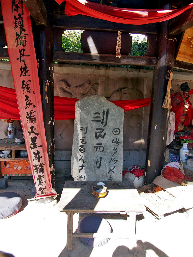 Podobný pocit jsem měl i z okresního města, kde jsem strávil několik hodin při čekání na autobus do Chuej-tungu, částečného cíle této části cesty. Při courání starým městem, při kterém jsem prošel kolem bubnové věže a maoistického sloganu, jenž se vyjímal na obrovském kamenném plátně na konci jedné z pěších ulic, jsem na jejím opačném konci objevil uličku jménem Siao-siang. Při vstupu byly dvě časem ohlodané stély z jedenáctého roku éry Kuang-sü (1885) a oltářík, na kterém ovšem chyběla soška bůžka štěstí, čímž působil poněkud opuštěně a vypadal spíše jako polička opředená letitými pavučinami. O několik kroků směrem vpřed byla dřevěná brána s nápisem „Si-čcheng“, alternativním názvem této kdysi slavné obchodní uličky, kolem ní pobíhaly iské děti a na jedné z kamenných laviček posedávala stará žena se sněhobílými vlasy. Matka dětí s pestrobarevným šátkem na hlavě si mě se zkřiveným výrazem ve tváři měřila od hlavy až k patě.